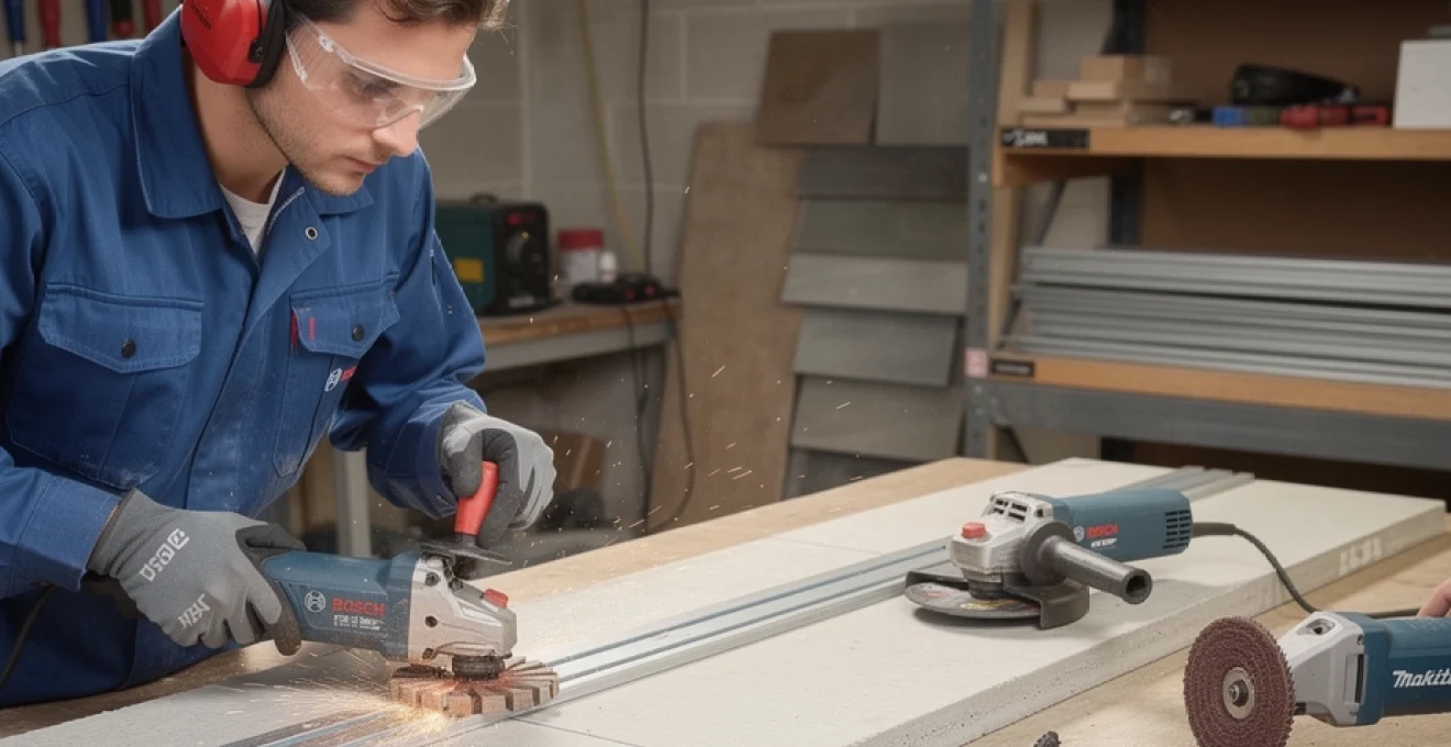 Pour des découpes parfaitement droites sur tôle, carrelage ou lame de parquet, l’usage d’un guide parallèle transforme la meuleuse d’angle en quasi-scie circulaire. Certains accessoires dédiés aux meuleuses Bosch GWS 7-115 et Makita GA5030 permettent de fixer un patin ou une semelle munie d’un guide parallèle réglable. Vous pouvez ainsi calibrer la profondeur de coupe en fonction de l’épaisseur du matériau, en laissant volontairement 1 à 2 mm de marge pour éviter les sur-coupes intempestives. Cette approche est particulièrement utile pour les saignées dans le mur ou les découpes partielles.